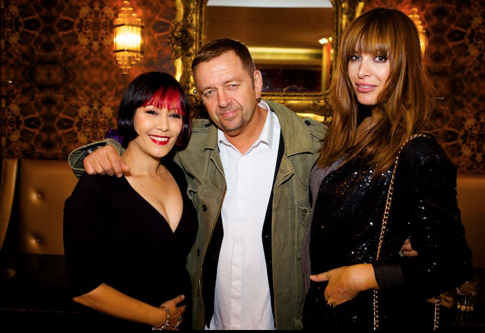 Three people posing together in a warmly lit, ornate room. The woman on the left has short black hair with red tips and is wearing a black V-neck top. The man in the middle has short brown hair, a beard, and is dressed in a white collared shirt with