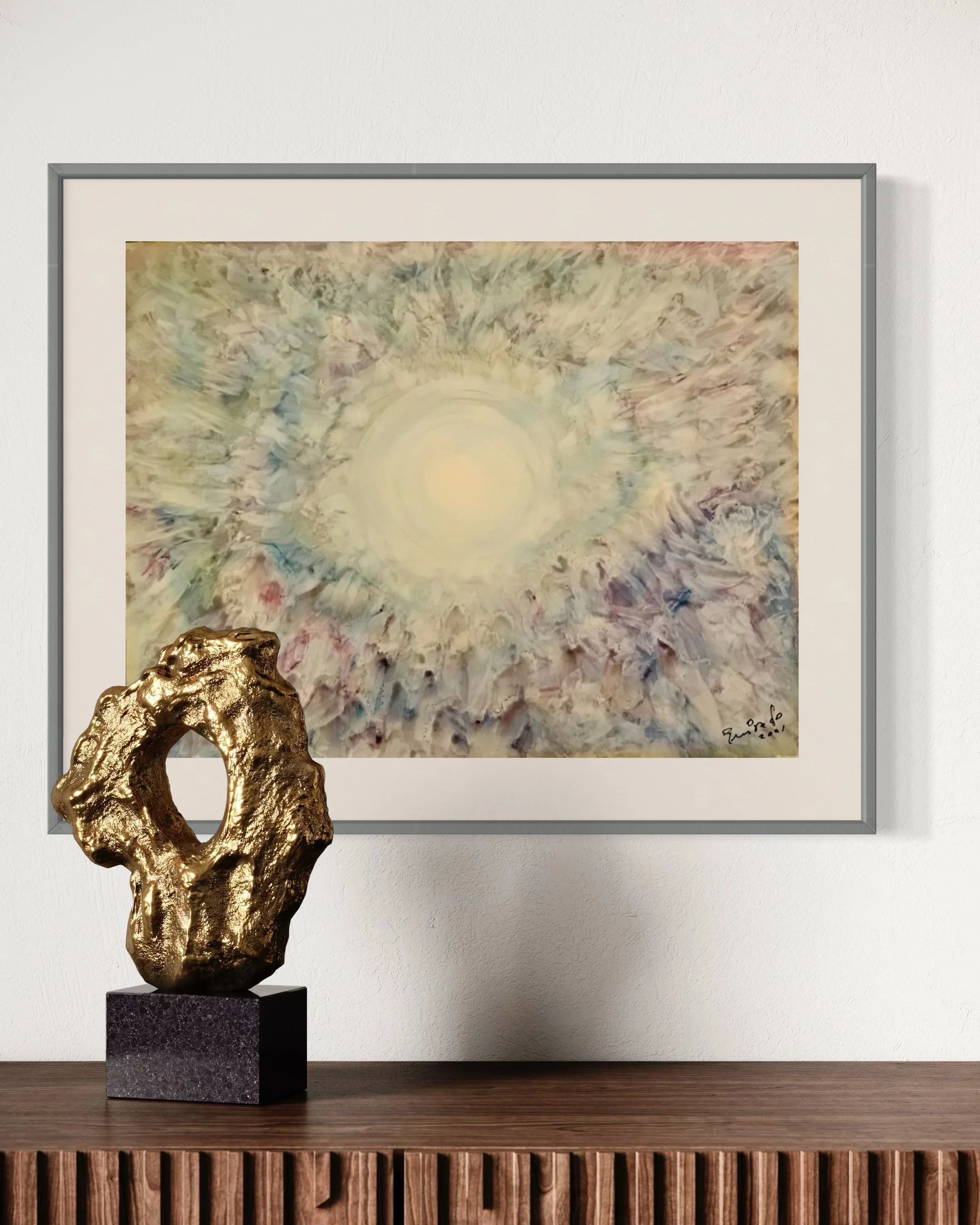 Karma Besos fuses my world — a wild, beautiful tangle of California wellness, 90s London rock glam, Mediterranean roots, and the spiritual legacy of my father’s paintings. I’ve taken his most mystical works — portals of consciousness and cosmic wisdom — and reimagined them into art, fashion, and sacred space design. Each piece is a collaboration across time and spirit… a continuation of the legacy, reborn in sensual form.
